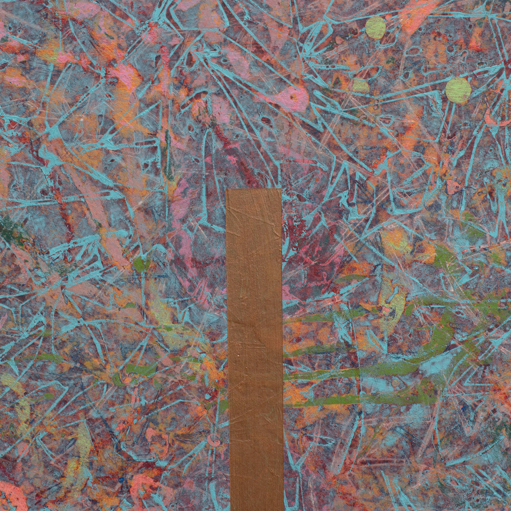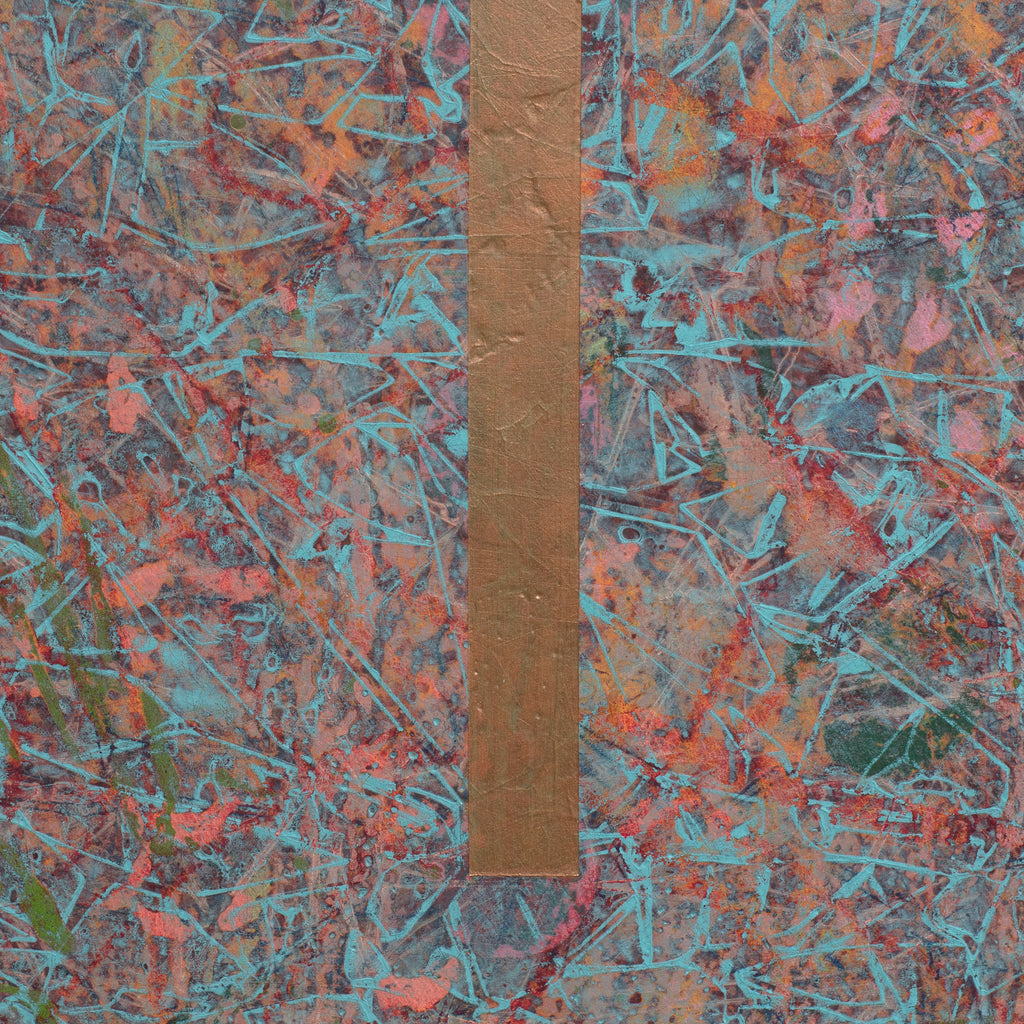 The texture and depth of this work is created by first layering marks using many different colors. I sand though the layers and harmonize the piece using several layers of glaze. Then I add surface detail to complete the painting.