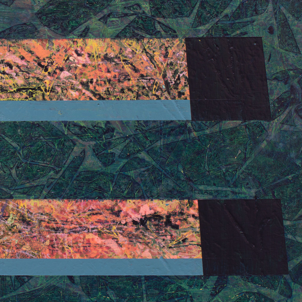The texture and depth of this work is created by first layering marks using many different colors. I sand though the layers and harmonize the piece using several layers of glaze. Then I add surface detail to complete the painting.