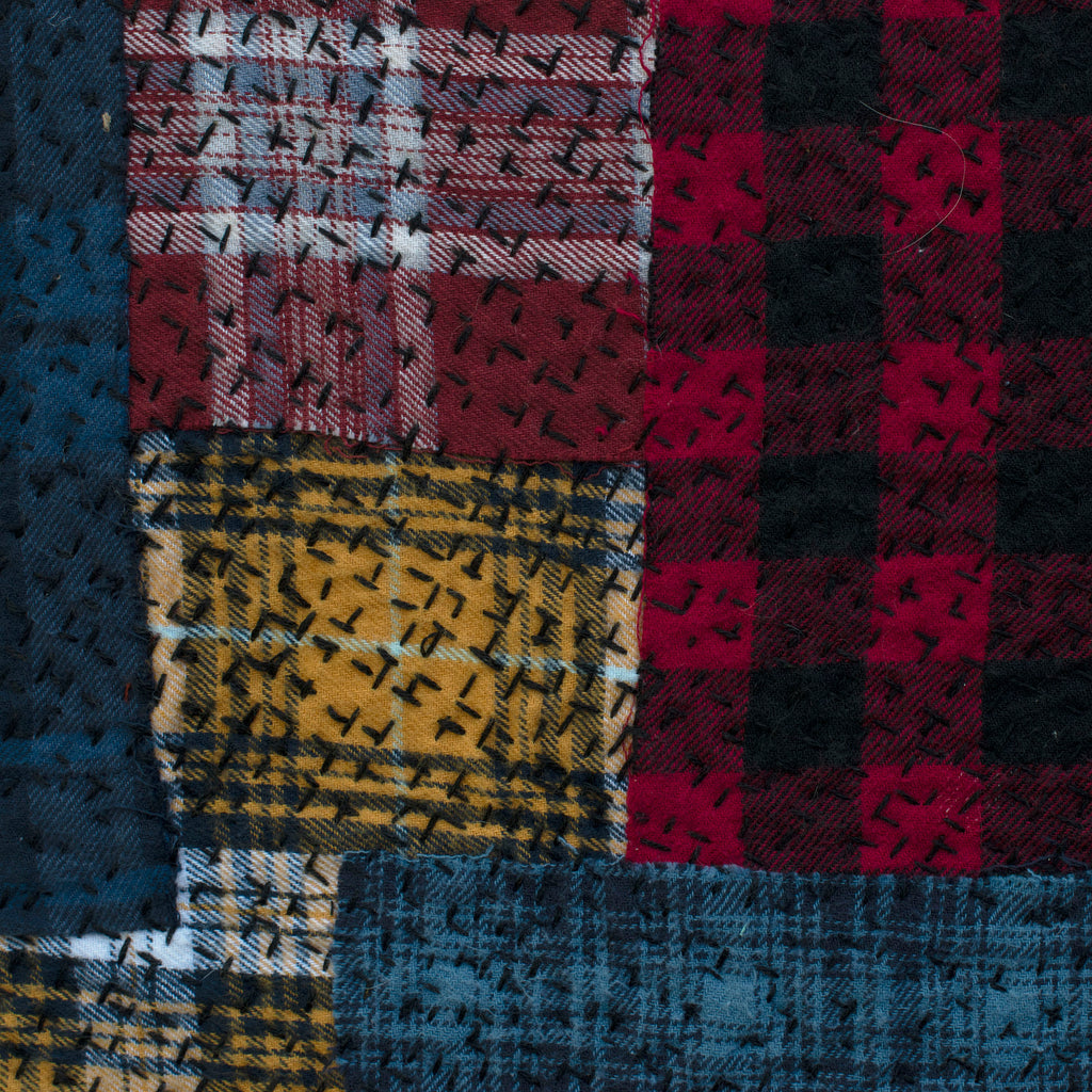 This piece is made from upcycled flannel shirts that have been cut up and reassembled into a new design. It's covered with contemplative stitching that holds it together, mending the worn disparate pieces into something new.