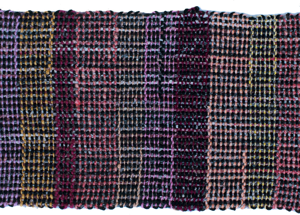Creating these scarves is like making a patchwork quilt. I don’t have a particular design in mind when I weave. I use a little of this and a little of that until I reach the end of the warp. Then I get to unroll the finished scarf and see what I’ve got!