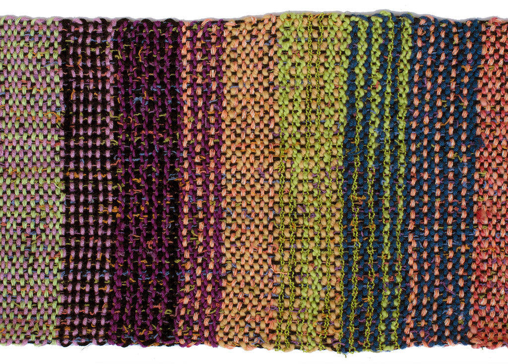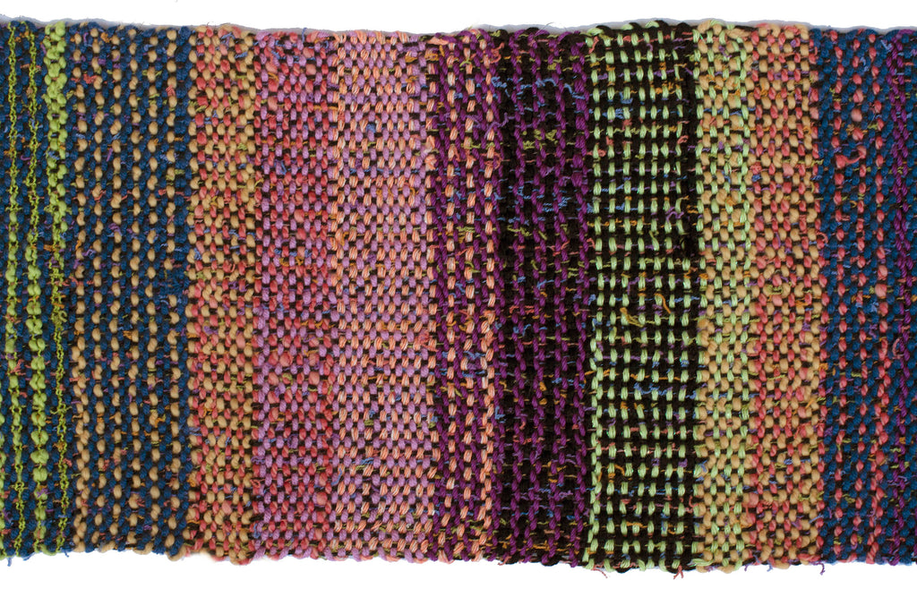 Creating these scarves is like making a patchwork quilt. I don’t have a particular design in mind when I weave. I use a little of this and a little of that until I reach the end of the warp. Then I get to unroll the finished scarf and see what I’ve got!