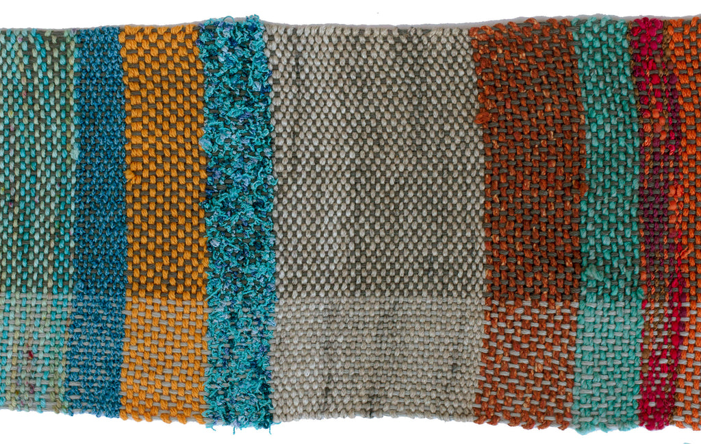 Creating these scarves is like making a patchwork quilt. I don’t have a particular design in mind when I weave. I use a little of this and a little of that until I reach the end of the warp. Then I get to unroll the finished scarf and see what I’ve got!