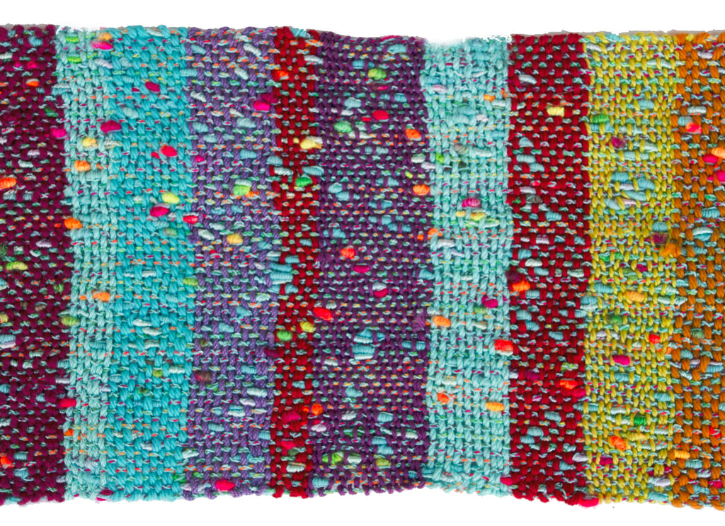 Creating these scarves is like making a patchwork quilt. I don’t have a particular design in mind when I weave. I use a little of this and a little of that until I reach the end of the warp. Then I get to unroll the finished scarf and see what I’ve got!