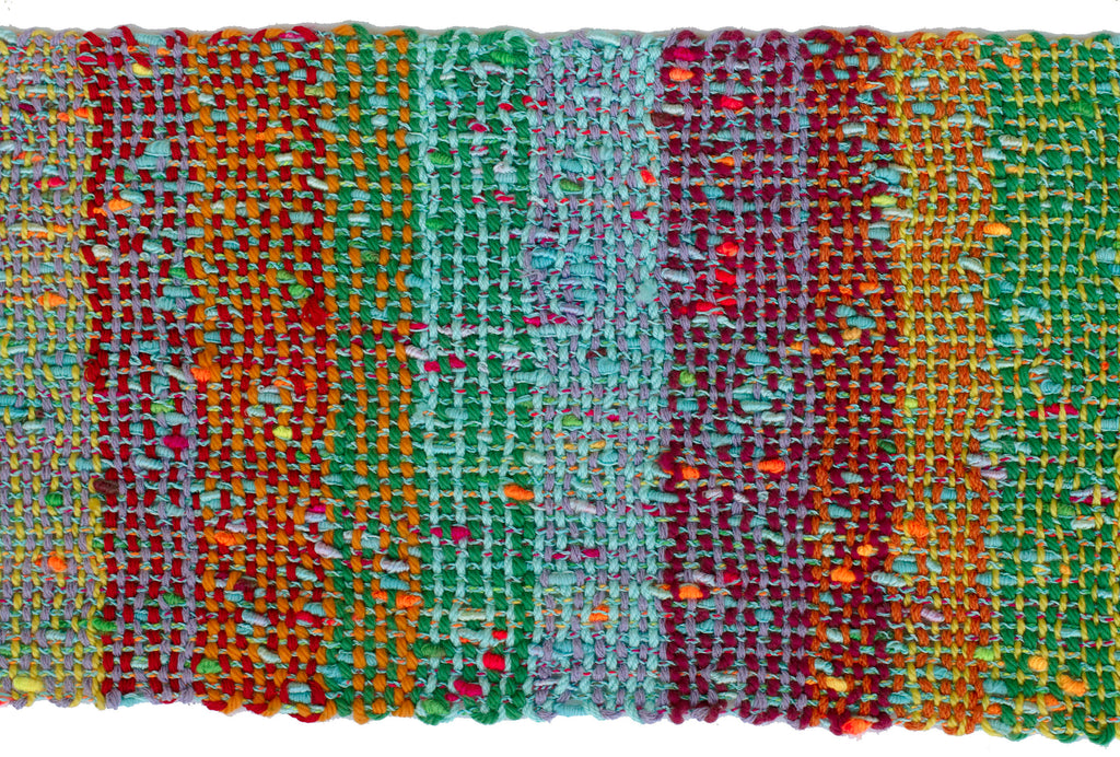 Creating these scarves is like making a patchwork quilt. I don’t have a particular design in mind when I weave. I use a little of this and a little of that until I reach the end of the warp. Then I get to unroll the finished scarf and see what I’ve got!