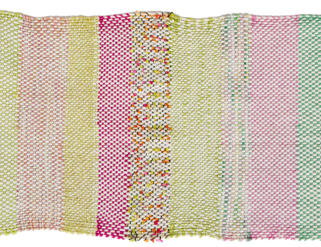 Creating these scarves is like making a patchwork quilt. I don’t have a particular design in mind when I weave. I use a little of this and a little of that until I reach the end of the warp. Then I get to unroll the finished scarf and see what I’ve got!