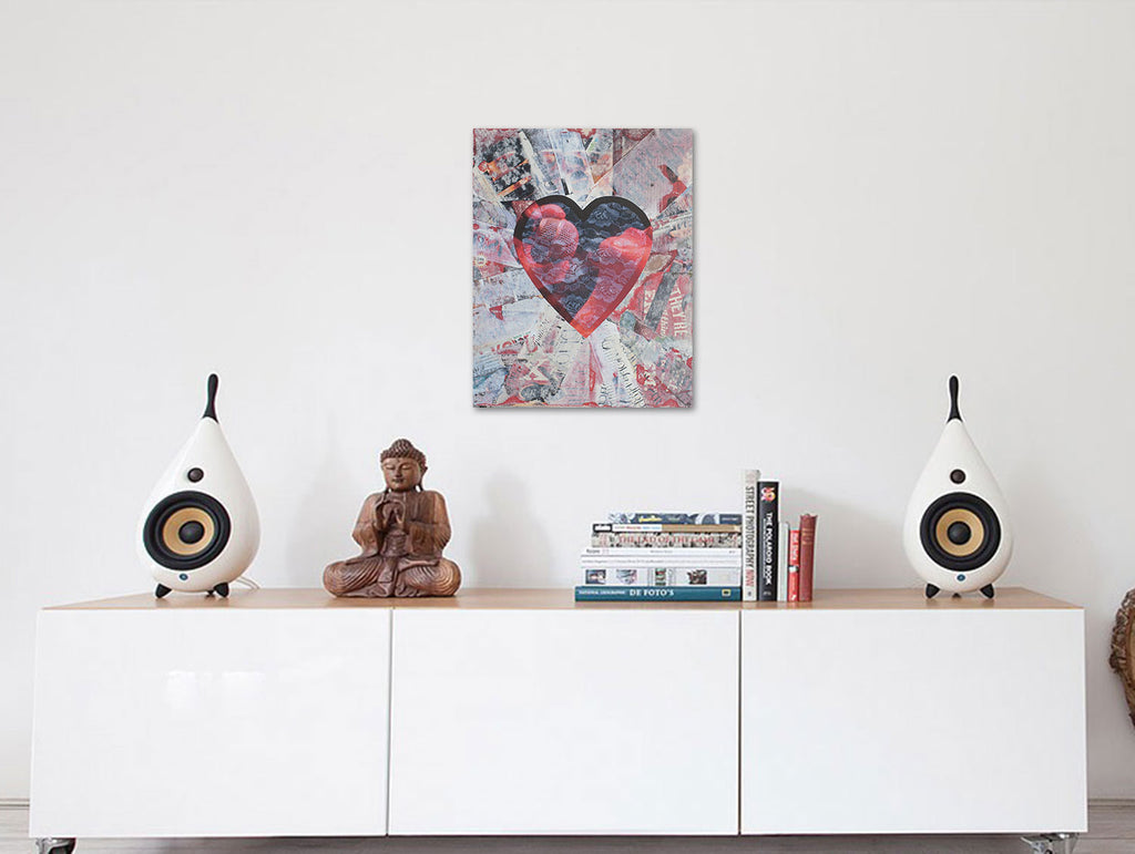 This heart collage is a one-of-a-kind piece created by layering images and text cut from discarded magazines. I use the cut pieces to make abstract designs that document my observations and feelings about the world.