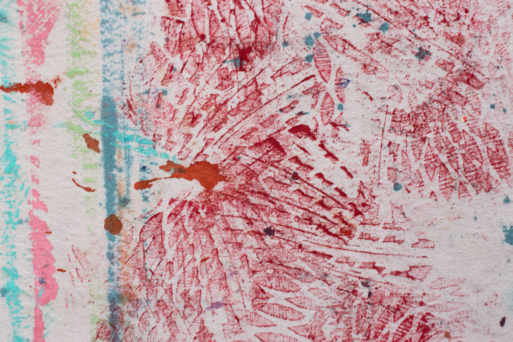 I like the unexpected pairing of the soft blue and green stripes with the graphic red shoe prints. The drips are a serendipitous touch.