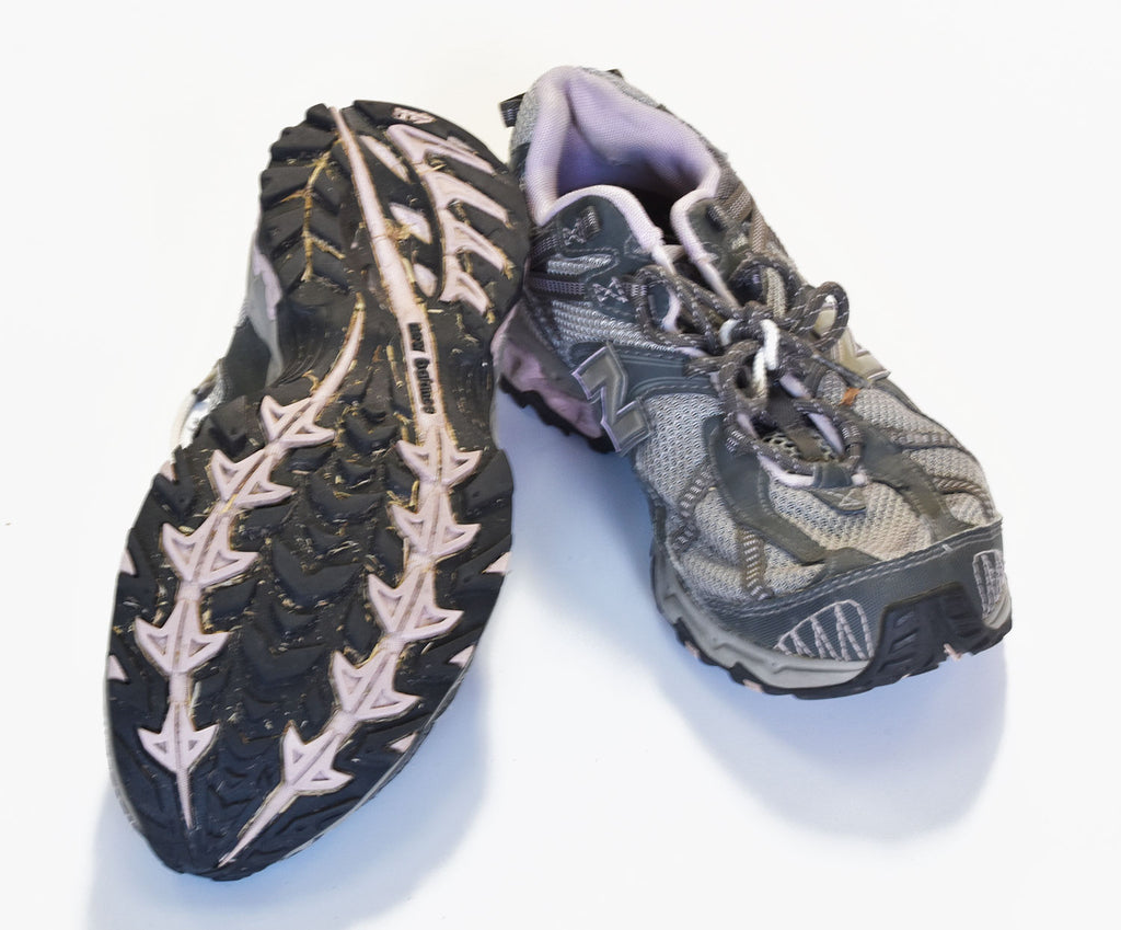 I search for shoes with interesting soles at local thrift stores. After deciding on my design, I put the shoes on, step in paint, and walk on the canvas to create the piece.